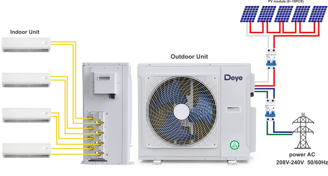 Dieses System macht einen externen Batteriespeicher überflüssig und integriert einen leistungsstarken Solar-MPPT-Booster und einen Dual-Mode-AC/DC-Wechselrichter direkt in die zentrale Außeneinheit. Die MPPT-Technologie sorgt durch die dynamische Anpassung an Schwankungen der Sonnenlichtintensität für eine maximale Erfassung der Sonnenenergie, während der eingebaute Wechselrichter einen nahtlosen Wechsel zwischen Solar-Gleichstrom und Netz-Wechselstrom ermöglicht, wobei die Versorgung mit erneuerbarer Energie priorisiert wird, um die Abhängigkeit von herkömmlichen Stromnetzen zu minimieren. Es eignet sich ideal für Wohnimmobilien mit mehreren Räumen oder kleine Geschäftsräume und bietet eine konsistente, zonenspezifische Temperaturregelung bei gleichzeitiger Reduzierung der Gesamtenergiekosten und des CO2-Fußabdrucks.